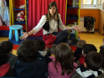 O desenvolvimento desta atividade contou somente com a intervenção de 4 crianças do grupo da sala laranja, sendo que estas são as que melhor conseguem já entoar uma voz mais forte para que toda a sala os conseguisse ouvir. A interação foi feita com as restantes crianças que assistiam, surgindo assim, um clima de interações positivas.